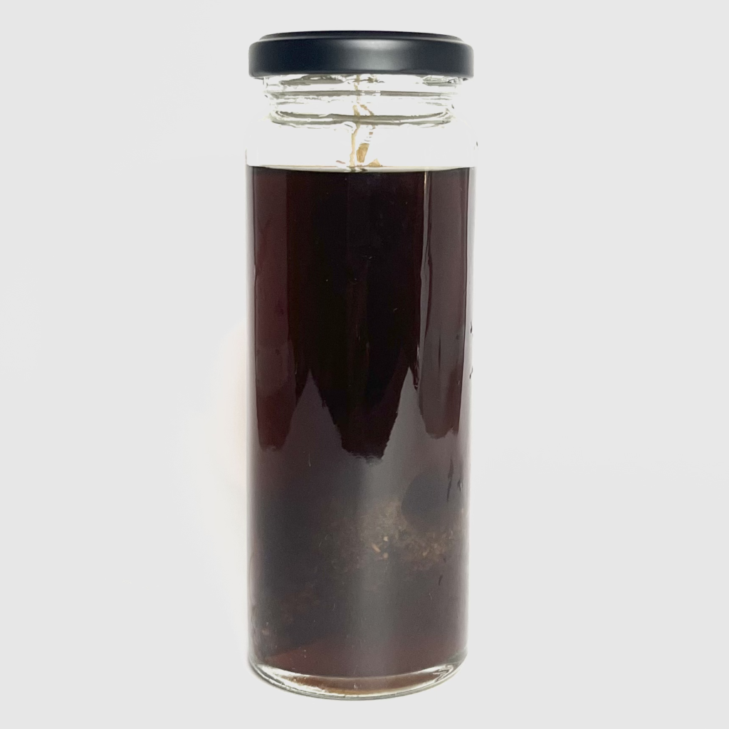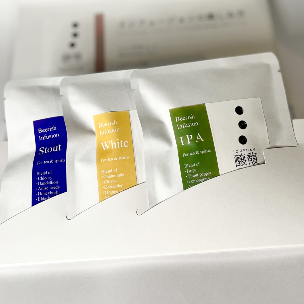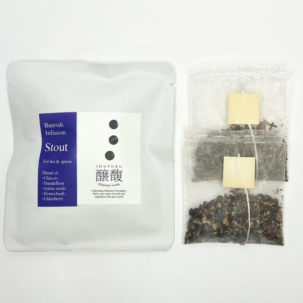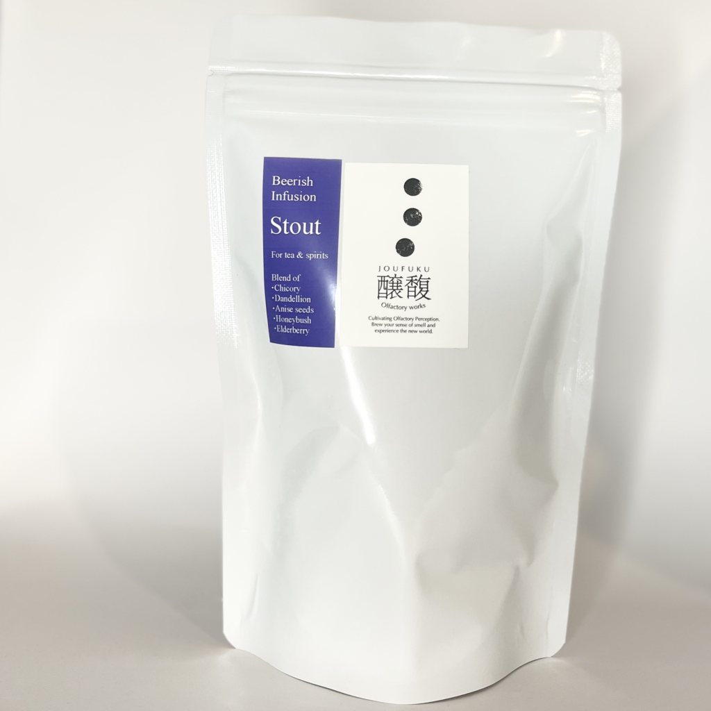 本作ではスタウトの黒い液色や焦げの風味を表現するため、ローストチコリをメイン素材に据えました。焦げた風味だけではなくカラメルのような甘味もあって、シングルでも非常に美味しいハーブです。今回はそこにローストハト麦をブレンドすることで揮発速度の異なるシャープな焦げ香も加わえて、多段階的な焙煎香を狙いました。
